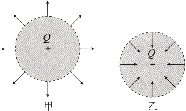 1. 点电荷的电场:一个电荷量为Q的点电荷,在与之相距r处的电场强度E = ________。根据上式可知,如果以电荷量为Q的点电荷为中心作一个球面,则球面上各点的电场强度大小________。当Q为正电荷时,电场强度E的方向沿半径________,如图甲所示;当Q为负电荷时,电场强度E的方向沿半径________,如图乙所示。