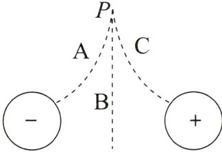 4. 静电在各种产业和日常生活中有着重要的应用,如静电除尘、静电复印等,所依据的基本原理几乎都是让带电的物质微粒在电场作用下奔向并吸附到电极上。现有三个粒子 A、B、C 从 P 点向下射入由正、负电极产生的电场中,它们的运动轨迹如图所示,则 ( )