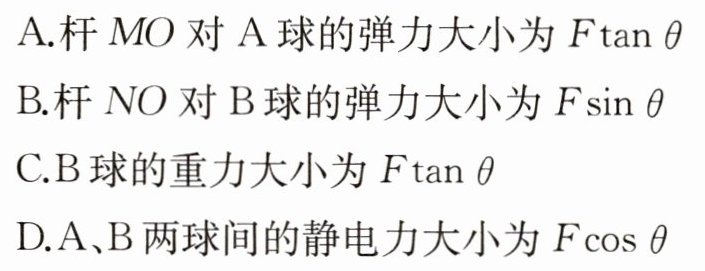 1. 如图所示,$MON$是固定的光滑绝缘直角杆,$MO$沿水平方向,$NO$沿竖直方向,$A$、$B$为两个套在此杆上的带有同种电荷的小球,水平向右的力$F$作用在$A$球上,使两球均处于静止状态,已知$A$、$B$两球连线与水平方向成$\theta$角。下列说法正确的是( )