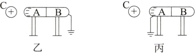 3. 图乙中,如果手握绝缘棒,把带正电荷的带电体$C$与导体$A$接触,导体$A$和$B$下部的金属箔有什么变化?为什么有这种变化?这是哪种起电方式?