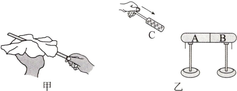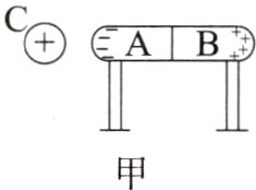 如图甲所示,玻璃棒与丝绸相互摩擦,它们都带了电。如图乙所示,取一对用绝缘柱支持的导体$A$和$B$,使它们彼此接触,起初它们不带电,贴在下部的两片金属箔是闭合的。