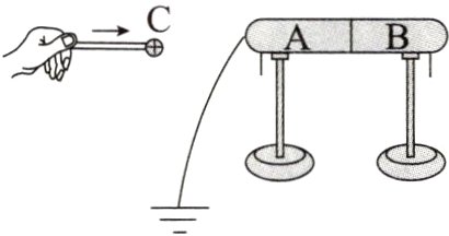 3.导体A、B下部的金属箔张开。带电体C与导体A接触,由于受到带电体C上正电荷的吸引,电子从导体A、B转移到带电体C,导体A、B失去电子而带正电荷,所以导体A和B下部的金属箔张开。接触起电。