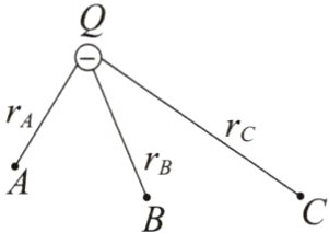 【例3】(多选)如图所示,在一负点电荷形成的电场中,有A、B、C三点,它们到点电荷的距离为$r_{A}<r_{B}<r_{C}$,且$U_{AB}=U_{BC}$,则( )