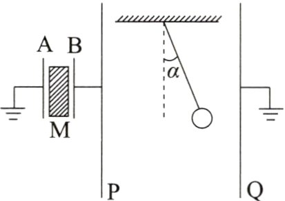 3. (多选)如图所示,M为中间插有电介质的电容器,A和B为其两极板,A板接地;P和Q为两竖直放置的平行金属板,在两板间用绝缘线悬挂一带电小球;P板与B板用导线相连,Q板接地。开始时悬线静止在竖直方向,在B板带电后,悬线偏转了α角度。在以下方法中,能使悬线的偏角α变大的是( )