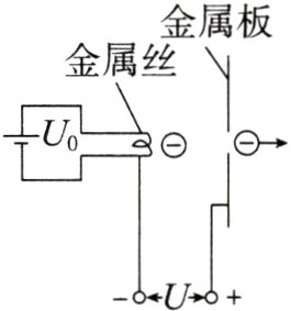【例 1】下图为电子枪的工作原理示意图,金属丝被加热后可以发射电子,发射出的电子被加速电场加速,穿出金属板上的小孔后,形成高速运动的电子束。其中加热电源的电压为 U₀,加速电压为 U。下列说法正确的是