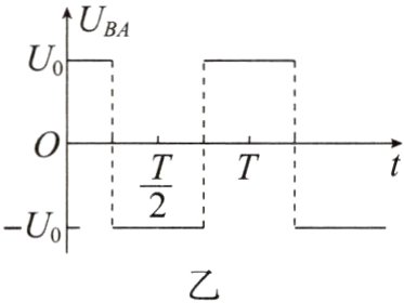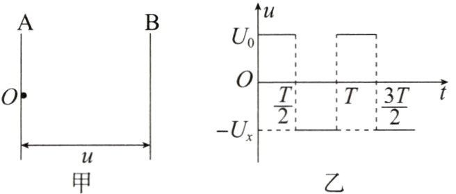 #### 4. 图甲为一间距为$d$、足够大的平行金属板,板间加有随时间变化的电压,如图乙所示,设$U_0$和$T$已知。$A$板上$O$处有一静止的带电粒子,其电荷量为$q$,质量为$m$ (不计重力),从$t = 0$时刻起,该带电粒子受板间电场作用加速向$B$板运动,途中由于电场反向,粒子又向$A$板返回(粒子未与$B$板相碰)。