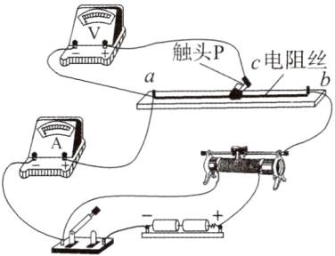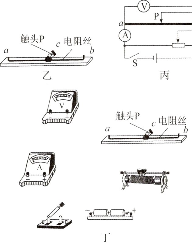 (2)为了测量该金属丝的电阻,实验小组取来两节干电池,并将金属丝拉直后两端固定在带有刻度的绝缘底座两端的接线柱上,底座的中间有一个可沿金属丝滑动的金属触头P,触头上固定了接线柱,按下P时,触头才与金属丝接触,触头的位置可以从刻度尺上读出,如图乙所示。实验采用的电路原理图如图丙所示。请根据该原理图,用笔画线代替导线将实物图丁连接成实验电路。