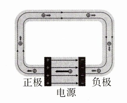 如图所示,电源在电路中的作用是不断地将流到负极的正电荷经过电源内部搬运到正极,从而保持正、负极有稳定的电势差,电路中有持续的电流。