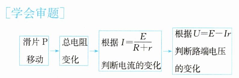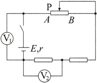 【例2】如图所示,电源电动势为E,内阻为r。闭合开关,当滑动变阻器的滑片P向B点移动时,电压表V1的读数U1与电压表V2的示数U2的变化情况是 ( )