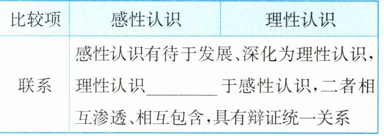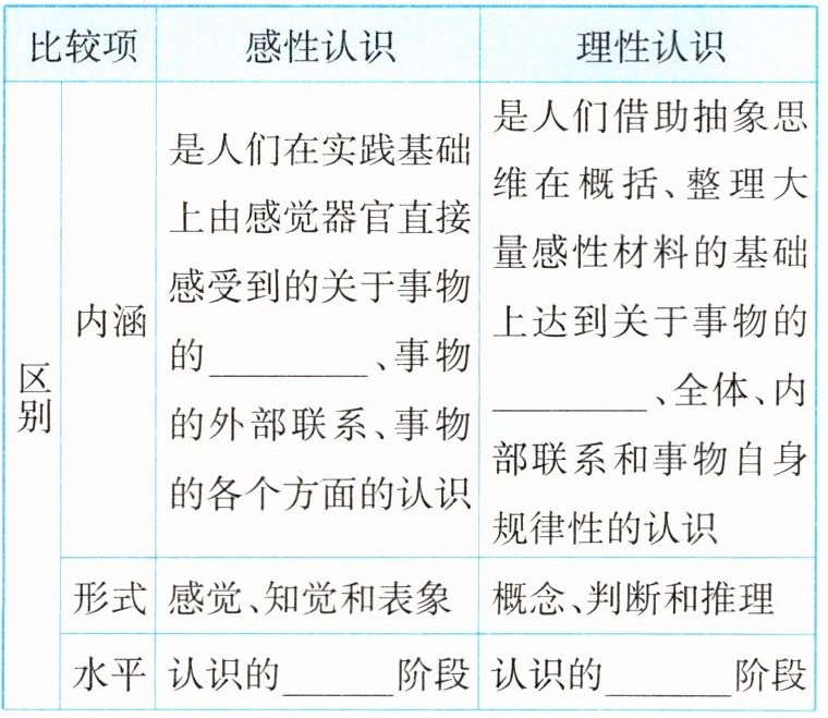 (2)形式:感性认识和理性认识是人们对客观世界的两种不同水平的反映形式,也是认识过程的两个不同阶段。