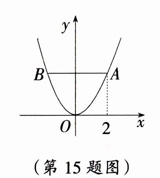 15. 已知二次函数y=$\frac{1}{2}$x²的图像如图所示,线段AB//x轴,交抛物线于A,B两点,且点A的横坐标为2,则AB的长度为 ____________.