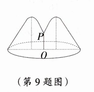 9. 如图,花坛水池中央有一喷泉,水管OP=3 m,水从喷头P喷出后呈抛物线状先向上至最高点后落下,若最高点距水面4 m,喷头P距抛物线对称轴1 m,则为使水不落到池外,水池半径最小为 ( )