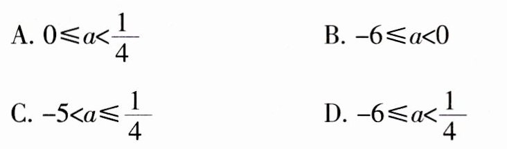 2. 已知二次函数$y=x^{2}-x+a$的图像与$x$轴的两个不同交点到原点的距离之和不超过5,则实数$a$的取值范围是( )