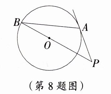 8. 如图,PA是⊙O的切线,切点为A,PO的延长线交⊙O于点B,连接AB,若∠B=25°,则∠P的度数为 ( )