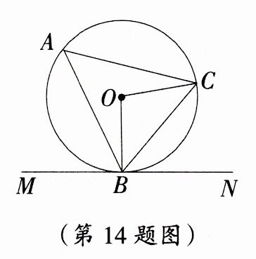 14. 如图,△ABC内接于⊙O,AB=AC,∠BOC=100°,MN是过点B且垂直于OB的直线,则∠ABM=______°,∠CBN=________°.