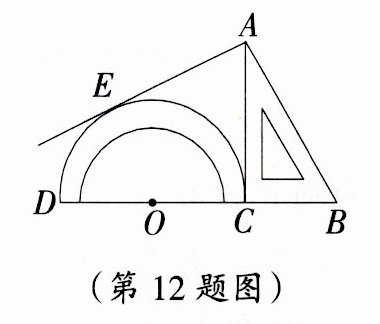 12. 如图,将量角器和含30°角的一块直角三角板紧靠着放在同一平面内,使D,C,B在一条直线上,且DC=2BC,过点A作量角器圆弧所在圆的切线,切点为E,则∠EAC的度数是____°.