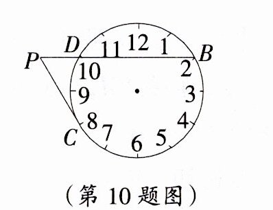 10. [创新意识]如图是一个钟表表盘,连接整点2时与整点10时的B,D两点并延长,交过整点8时的切线于点P,若表盘的半径长为√3 ,则PC的长为 ( )