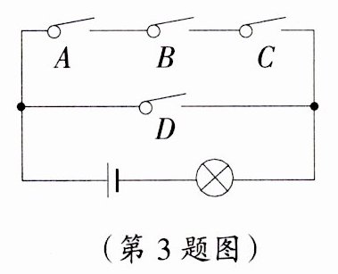 3. 习题变式教材P83,BT1改编 如图,电路图上有四个开关A,B,C,D和一个小灯泡,闭合开关D或同时闭合开关A,B,C都可使小灯泡发光,则任意闭合其中两个开关,小灯泡发光的概率是( )