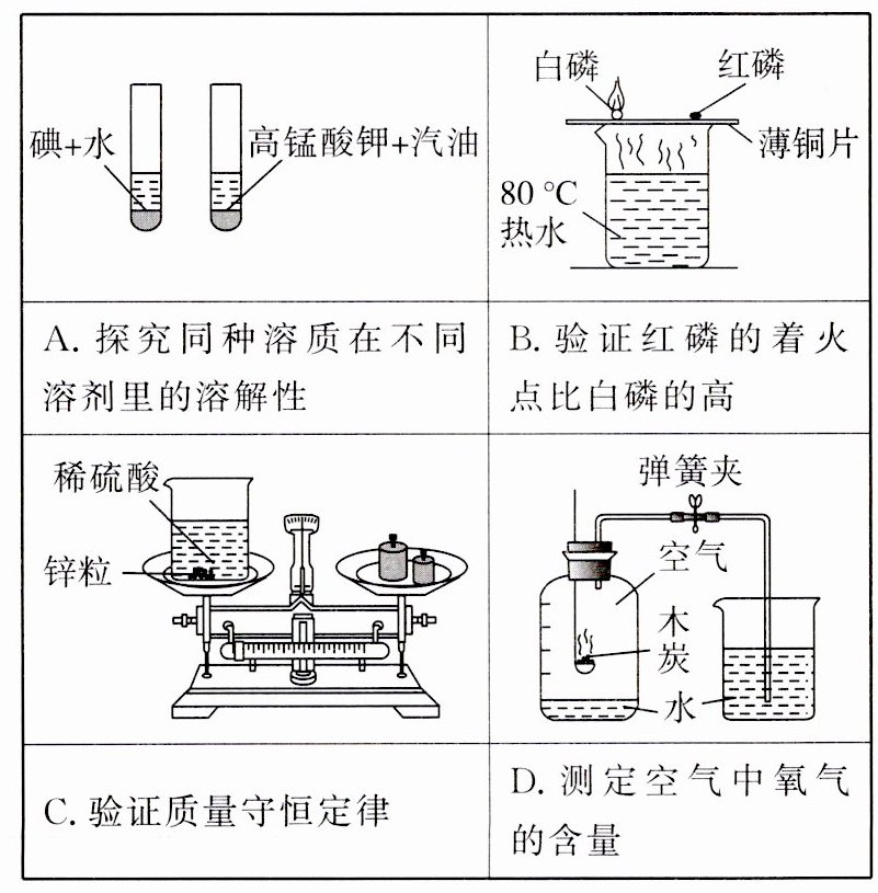 |C|将一根用砂纸打磨过的铝丝浸入硫酸铜溶液一段时间|铝丝表面出现红色固体,溶液蓝色变浅|金属活动性:Cu>Al|