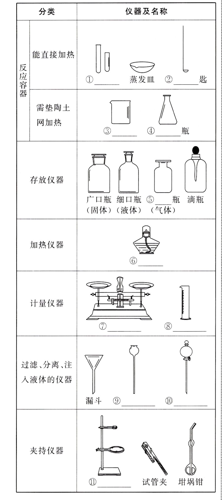 ①试管 ②燃烧 ③烧杯 ④锥形 ⑤集气 ⑥酒精灯 ⑦托盘天平 ⑧量筒 ⑨长颈漏斗 ⑩分液漏斗 ⑪铁架台 ⑫胶头滴管 ⑬玻璃棒