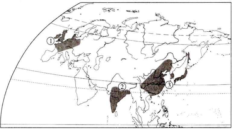 (1)欧洲西部 亚洲南部 亚洲东部