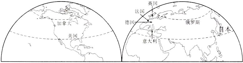 材料三 “七国集团”和俄罗斯的分布示意图。
