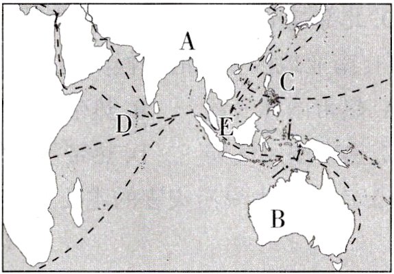 (1)图中字母表示的地理事物为:A______洲;B______洲;C______洋;D______洋;E______海峡