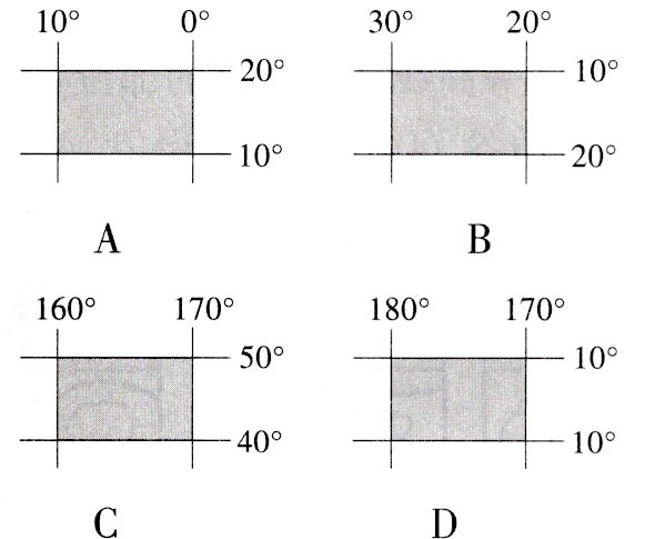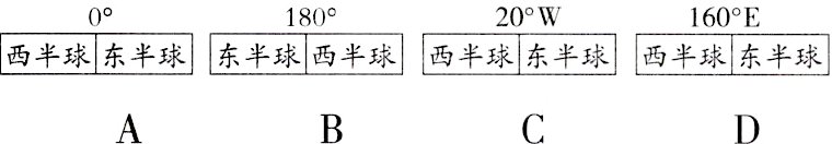 6. 下列图中阴影部分位于西半球、北半球的是( )