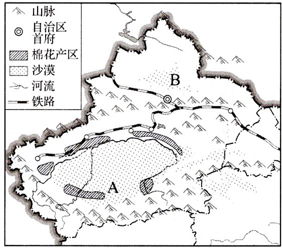 (1)从图中可以看出,新疆的地形轮廓特点是______________,其中A是______________盆地,B是________盆地。