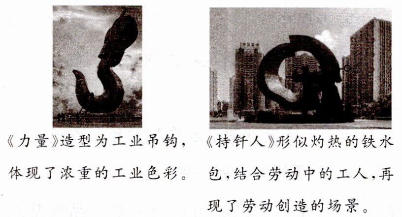 城市雕塑反映着一个城市的历史和精神气质。沈阳市铁西区是我国著名的传统工业区。目前,铁西区在汽车整车及零部件产业、先进装备制造业、医药化工产业和工业旅游及文化创意产业等领域实施高质量发展的战略目标,扛起了“东北振兴、铁西先行”的使命担当。下面是一组表现铁西区工业历史的代表性城市雕塑。读图,回答10~11题。