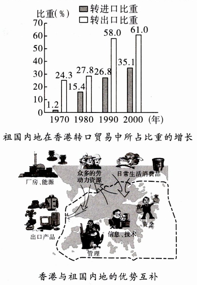 (1)由“祖国内地在香港转口贸易中所占比重的增长”图可以看出,从1970年到2000年的三十年中,祖国内地在香港转口贸易中所占比重增长最快的十年是 ( )