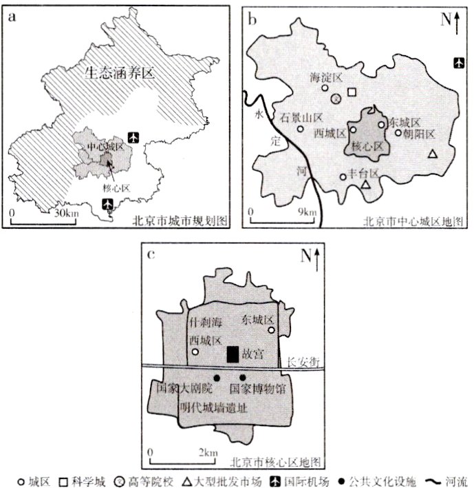 北京市是全国政治、文化和国际交往中心,为落实城市战略定位,疏解非首都功能,新的城市规划将全市划分为核心区、中心城区、生态涵养区等区域。读图(a、b、c),回答 15~16 题。