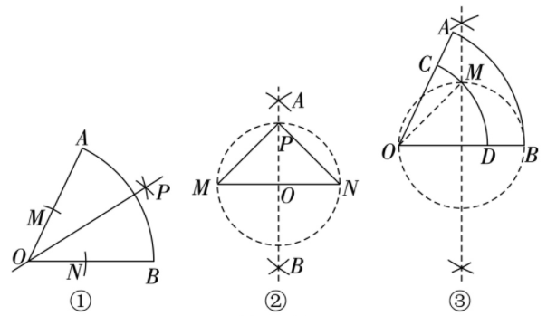 (3)问题再解:如图③,已知扇形$OAB$,请你用圆规和无刻度的直尺作一条以点$O$为圆心的圆弧,使扇形的面积被这条圆弧平分。