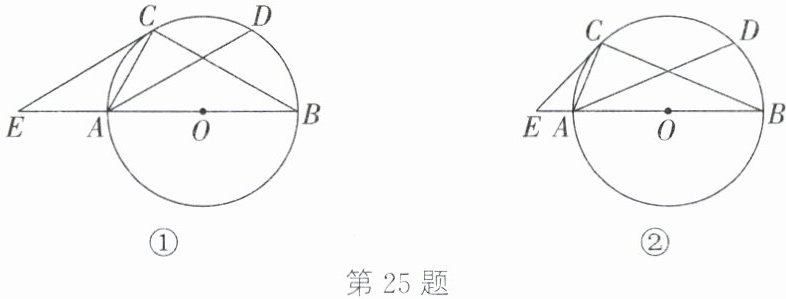 25. (8分)如图,$\odot O$是$\triangle ABC$的外接圆,$AB$是$\odot O$的直径,点$D$在$\overset{\frown}{BC}$上,$\overset{\frown}{AC}=\overset{\frown}{BD}$,点$E$在$BA$的延长线上,$\angle CEA=\angle CAD$。