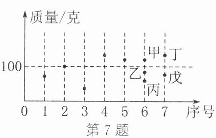 7. 某公司拟推出由7个盲盒组成的套装产品,现有10个盲盒可供选择,统计这10个盲盒的质量如图所示.序号为1到5号的盲盒已选定,这5个盲盒质量的中位数恰好为100克,6号盲盒从甲、乙、丙中选择1个,7号盲盒从丁、戊中选择1个,使选定7个盲盒质量的中位数仍为100克,可以选择()