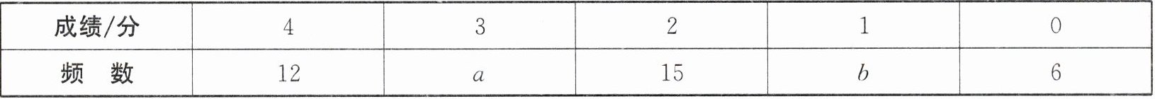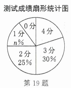 19. (14分)为加强体育锻炼,增强学生体质,某校在“阳光体育一小时”活动中组织九年级学生定点投篮技能测试,每人投篮4次,投中一次计1分.随机抽取m名学生的成绩作为样本,将收集的数据整理并绘制成如下的统计图表.