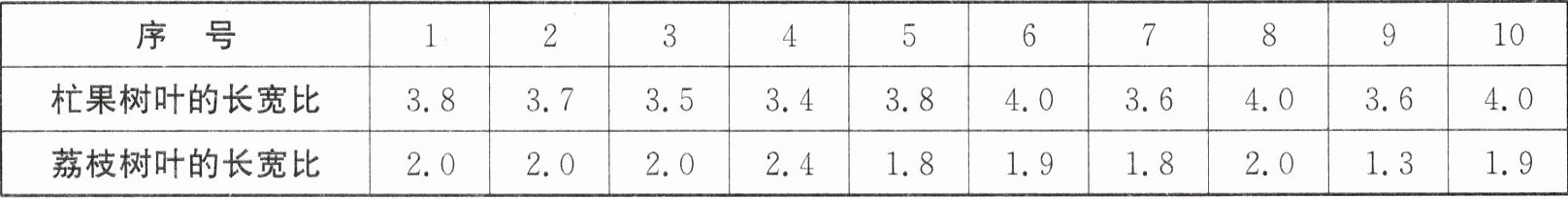 【实践发现】同学们随机收集杧果树、荔枝树的树叶各10片,通过测量得到这些树叶的长、宽的数据后,分别计算长宽比,整理数据如下: