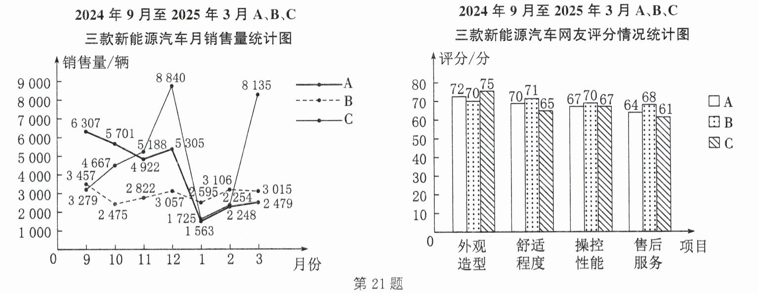 21. (20分)小明的爸爸准备购买一辆新能源汽车.在爸爸的预算范围内,小明收集了A、B、C三款新能源汽车在2024年9月至2025年3月的国内销售量和网友对车辆的外观造型、舒适程度、操控性能、售后服务这四项的评分情况,并绘制成统计图如图所示.