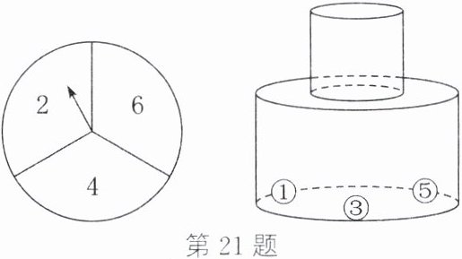 21. (15分)有一个可自由转动的转盘,被分成了三个大小相同的扇形,分别标有数字2、4、6;另有一个不透明的瓶子,装有分别标有数字1、3、5的三个完全相同的小球(如图)。小杰先转动一次转盘,停止后记下指针指向的数字(若指针指在分界线上则重转),小玉再从瓶子中随机取出一个小球,记下小球上的数字。将小杰记下的数字用$a$表示,小玉记下的数字用$b$表示,这两个数字组成的数对用$(a,b)$表示。
