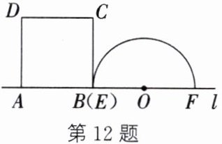 12. 如图,矩形ABCD与以EF为直径的半圆O在直线l的上方,线段AB与点E、F都在直线l上,且$AB=7,EF=10,BC>5$.点B从点E处出发,沿射线EF的方向运动,矩形ABCD随之运动.在点B运动的过程中,当AD、BC都与半圆O相交时,设这两个交点为G、H,连接OG、OH.若$∠GOH$为直角,求此时BE的长.