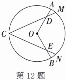 12. 如图,在$\odot O$中,C是$\overset{\frown}{ACB}$的中点,D、E分别是OA、OB上的点,且$AD=BE$,弦CM、CN分别过点D、E.求证: