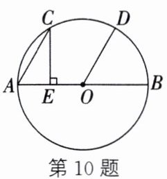 10. 如图,AB是$\odot O$的直径,C、D为半圆O的三等分点,$CE⊥AB$于点E,连接AC、OD,则$∠ACE$的度数为.