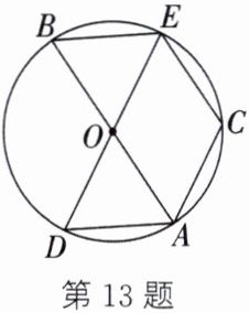 13. 如图,AB、DE为$\odot O$的直径,C是$\odot O$上一点,且$\overset{\frown}{AD}=\overset{\frown}{CE}$,连接BE、CE、AC、AD.