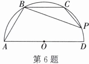 6. (2024·海南)如图,AD是半圆O的直径,点B、C在半圆上,且$\overset{\frown}{AB}=\overset{\frown}{BC}=\overset{\frown}{CD}$,点P在$\overset{\frown}{CD}$上.若$∠PCB=130^{\circ}$,则$∠PBA$的度数为 ()