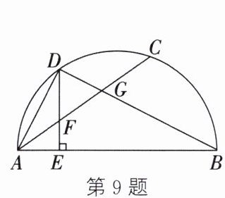 9. (2024·长春)如图,AB是半圆的直径,AC是一条弦,D是$\overset{\frown}{AC}$的中点,$DE⊥AB$于点E,交AC于点F,DB交AC于点G,连接AD.给出下面2个结论:①$∠ABD=∠DAC$;②$AF=FG$.上述结论中,正确结论的序号有.