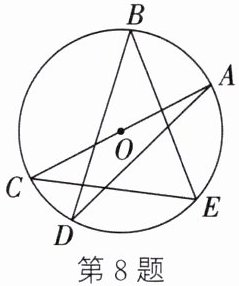 8. (整体思想)如图,点A、B、C、D、E均在$\odot O$上,且AC为$\odot O$的直径,连接AD、CE、BD、BE,则$∠A+∠B+∠C=$$^{\circ}$.