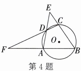 4. 如图,四边形ABCD是$\odot O$的内接四边形,AD与BC的延长线交于点E,BA与CD的延长线交于点F,$∠DCE=80^{\circ },∠F=25^{\circ }$,则$∠E$的度数为.