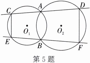 5. 如图,$\odot O_{1}$和$\odot O_{2}$都经过A、B两点.经过点A的直线CD交$\odot O_{1}$于点C,交$\odot O_{2}$于点D;经过点B的直线EF交$\odot O_{1}$于点E,交$\odot O_{2}$于点F.试判断CE与DF是否平行,并说明理由.