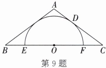 9. (2024·武汉改编)如图,$△ABC$为等腰三角形,O是底边BC的中点,腰AC与半圆O相切于点D,底边BC与半圆O交于E、F两点.