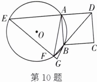 10. 如图,四边形ABCD是正方形,点A、B在$\odot O$上,边DA的延长线交$\odot O$于点E,对角线DB的延长线交$\odot O$于点F,连接EF并延长至点G,使$∠FBG=∠FAB$.